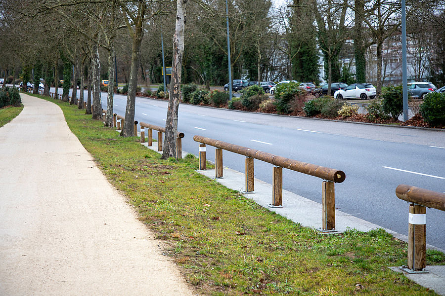 Elle mesure en moyenne 3,50 mètres de largeur, offre une sécurité renforcée aux usagers et une vraie séparation physique des voies circulées avec une lisse bois installée tout le long de la voie, accompagnée d’une noue qui a pu être aménagée grâce à la désimpéméabilisation des espaces entre les arbres. Tous les arbres ont été conservés et de nouveaux seront plantés afin de compléter l’alignement.