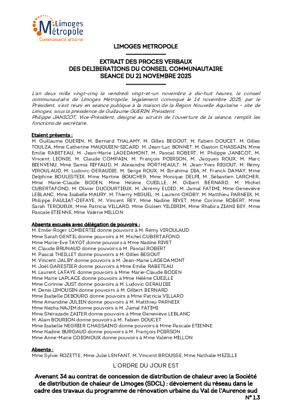 DélibérationAvenant 34 au contrat de concession de distribution de chaleur avec la Société de distribution de chaleur de Limoges (SDCL) : dévoiement du réseau dans le cadre des travaux du programme de rénovation urbaine du Val de l'Aurence sud1 documentPublié le 25 Novembre 2025 Délibération du 21 novembre 2025 1_3.pdf (.pdf, 213,6 Ko) Télécharger PrécédentRetour à la listeSuivant