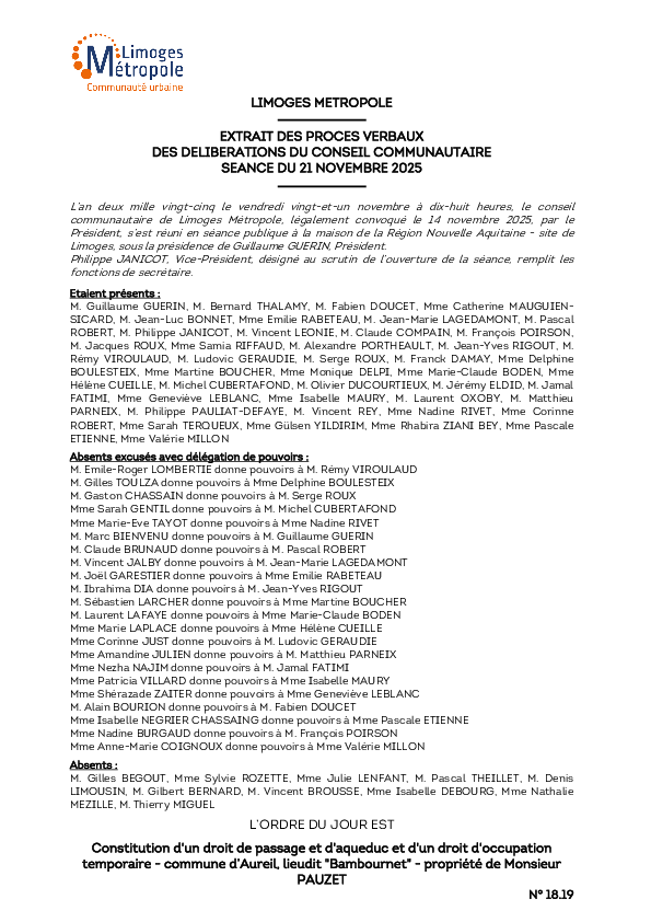 DélibérationConstitution d'un droit de passage et d'aqueduc et d'un droit d'occupation temporaire - commune d’Aureil, lieudit "Bambournet" - propriété de Monsieur PAUZET 1 documentPublié le 4 Décembre 2025 Délibération du 21 novembre 2025 18_19.pdf (.pdf, 235,0 Ko) Télécharger PrécédentRetour à la listeSuivant
