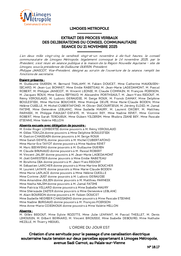 DélibérationCréation d’une servitude pour le passage d’une canalisation électrique souterraine haute tension sur deux parcelles appartenant à Limoges Métropole, avenue Sadi Carnot, au Palais-sur-Vienne1 documentPublié le 4 Décembre 2025 Délibération du 21 novembre 2025 18_17.pdf (.pdf, 228,1 Ko) Télécharger PrécédentRetour à la listeSuivant