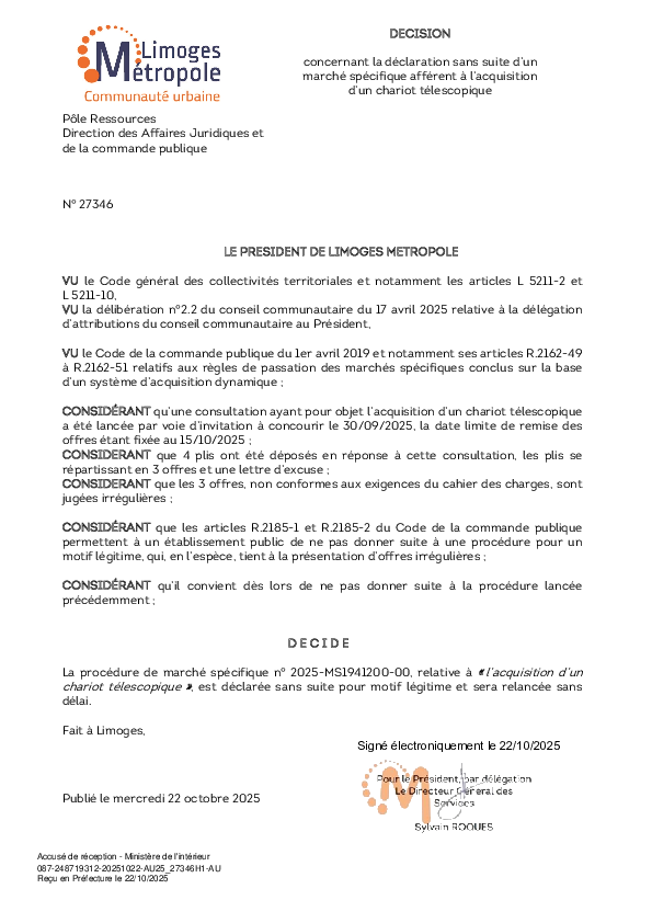 DécisionDécision concernant la déclaration sans suite d'un marché spécifique afférent à l'acquisition d'un chariot télescopique1 documentPublié le 22 Octobre 2025 Décision 27346.pdf (.pdf, 239,2 Ko) Télécharger PrécédentRetour à la listeSuivant