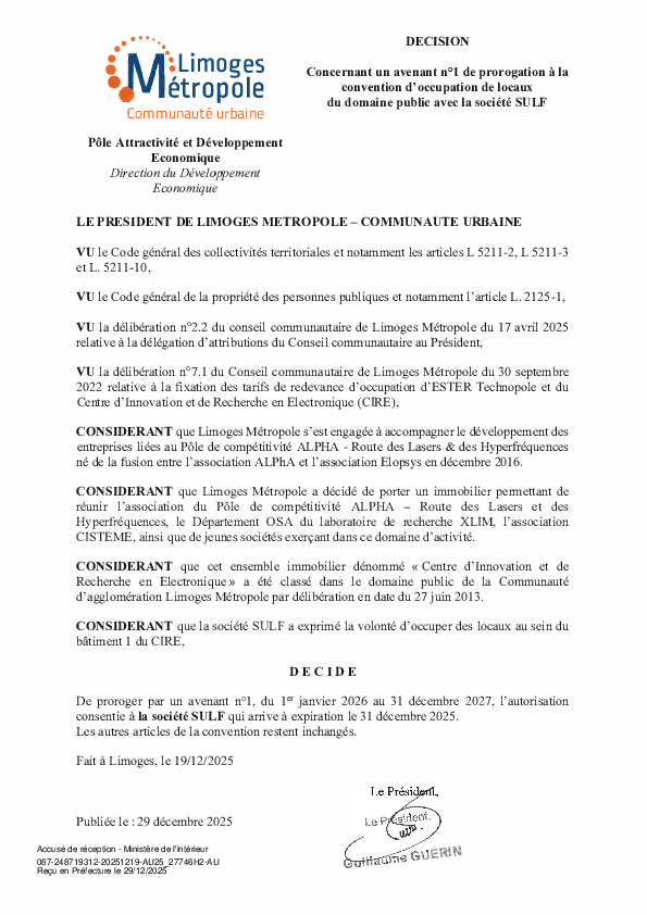 Décision concernant un avenant n°1 de prorogation à la convention d'occupation de locaux du domaine public avec la société SULF