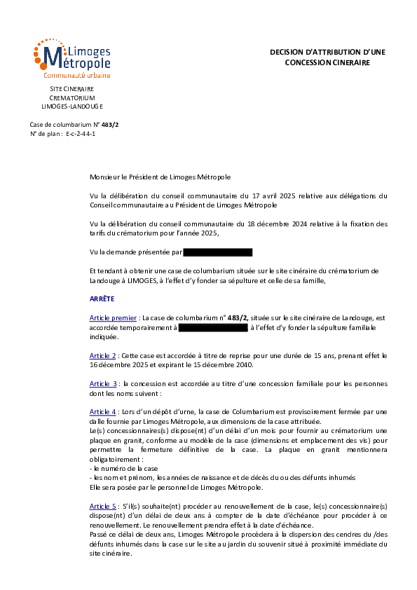 DécisionDécision d'attribution d'une concession cinéraire - 483_21 documentPublié le 18 Décembre 2025 DEC_FUNER_483_2_ATTRIBUTION_CONCESSION.pdf (.pdf, 329,6 Ko) Télécharger PrécédentRetour à la listeSuivant