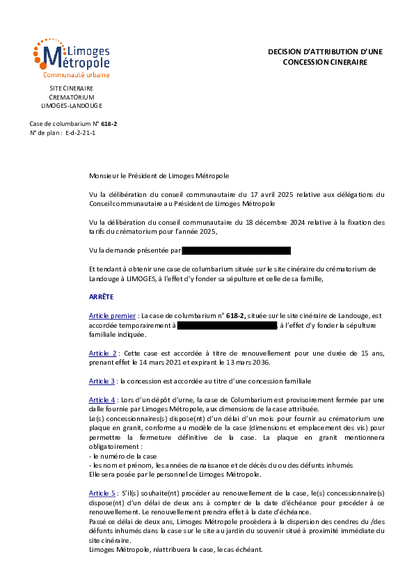DécisionDécision d'attribution d'une concession cinéraire - 618-2 1 documentPublié le 2 Décembre 2025 DEC_FUNER_618_2_ATTRIBUTION_CONCESSION.pdf (.pdf, 329,8 Ko) Télécharger PrécédentRetour à la listeSuivant
