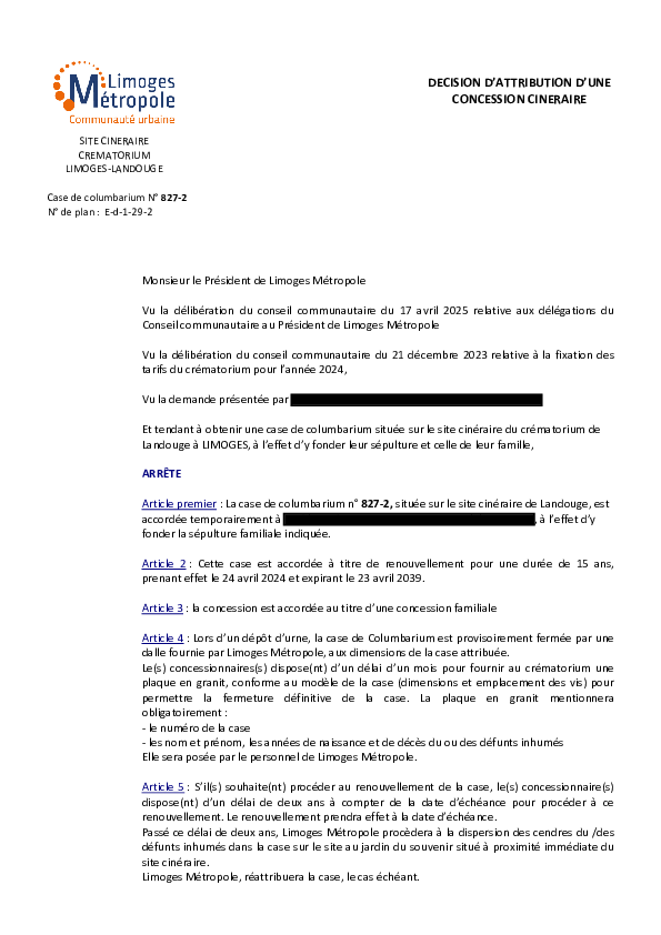DécisionDécision d'attribution d'une concession cinéraire - 827-21 documentPublié le 2 Décembre 2025 DEC_FUNER_827_2_ATTRIBUTION_CONCESSION.pdf (.pdf, 519,2 Ko) Télécharger PrécédentRetour à la listeSuivant
