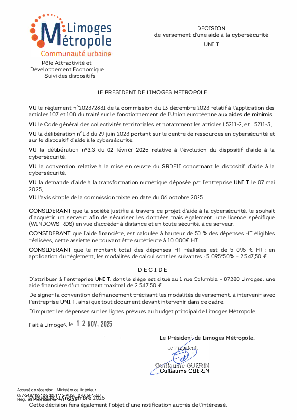 DécisionDécision de versement d une aide à la cybersécurité à l'entreprise UNI T1 documentPublié le 17 Novembre 2025 27505.pdf (.pdf, 110,7 Ko) Télécharger PrécédentRetour à la listeSuivant