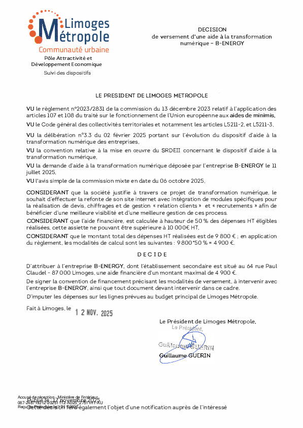 DécisionDécision de versement d une aide à la transformation numérique à l'entreprise B-ENERGY1 documentPublié le 17 Novembre 2025 27511.pdf (.pdf, 102,1 Ko) Télécharger PrécédentRetour à la listeSuivant