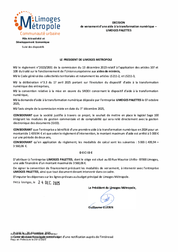 Décision de versement d une aide à la transformation numérique à l'entreprise LIMOGES PALETTES