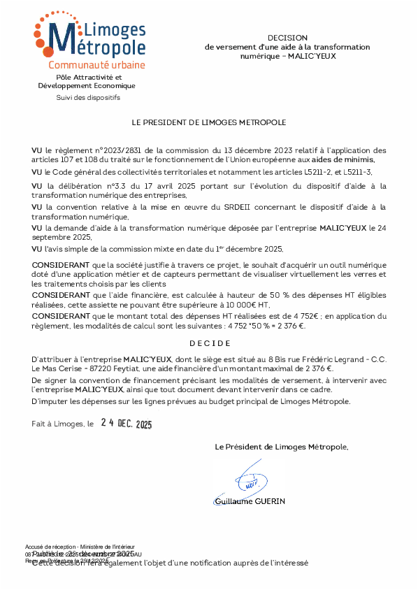 Décision de versement d une aide à la transformation numérique à l'entreprise MALIC YEUX
