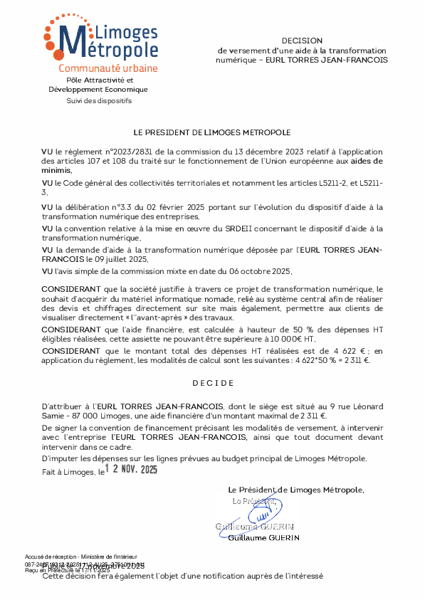DécisionDécision de versement d une aide à la transformation numérique à l'EURL TORRES JEAN-FRANCOIS1 documentPublié le 17 Novembre 2025 27510.pdf (.pdf, 102,5 Ko) Télécharger PrécédentRetour à la listeSuivant