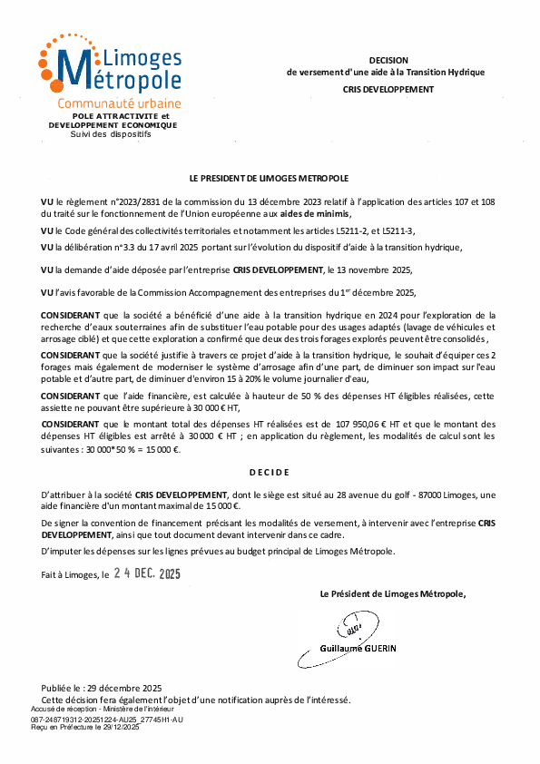 Décision de versement d'une aide à la transition hydrique à la société CRIS DEVELOPPEMENT