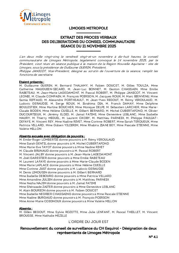 DélibérationRenouvellement du conseil de surveillance du CH Esquirol - Désignation de deux représentants de Limoges Métropole1 documentPublié le 2 Décembre 2025 Délibération du 21 novembre 2025 4_1.pdf (.pdf, 204,7 Ko) Télécharger PrécédentRetour à la listeSuivant