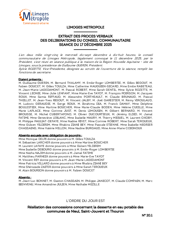 DélibérationRésiliation des concessions concernant la desserte en eau potable des communes de Nieul, Saint-Jouvent et Thouron1 documentPublié le 19 Décembre 2025 Délibération du 17 décembre 2025 20_1.pdf (.pdf, 219,4 Ko) Télécharger Retour à la listeSuivant