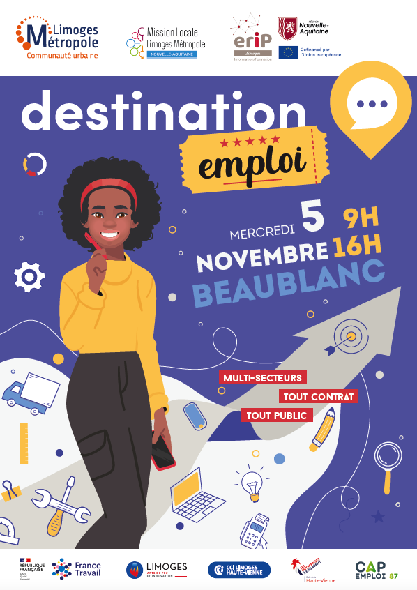 Après le succès de l'édition précédente, Limoges Métropole et l'ERIP Limoges, porté par la Mission Locale Limoges, organisent la seconde édition de Destination Emploi : multi-secteurs, tout contrat, tout public. Les acteurs de l’emploi et de la formation et les entreprises du territoire se mobilisent ainsi sur une journée entière.