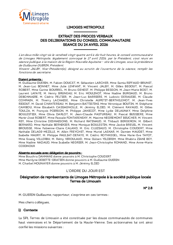 5. Désignation de représentants de Limoges Métropole à la société publique locale Terres de Limousin