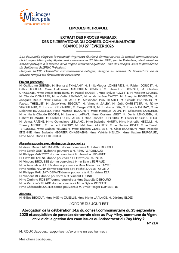 DélibérationAbrogation de la délibération 14.6 du conseil communautaire du 25 septembre 2025 et acquisition de parcelles de terrain sises au Puy Méry, commune du Vigen, en vue de la gestion des eaux issues du lotissement du Puy Méry 21 documentPublié le 6 Mars 2026 Délibération du 27 février 2026 21_4.pdf (.pdf, 654,2 Ko) Télécharger PrécédentRetour à la listeSuivant