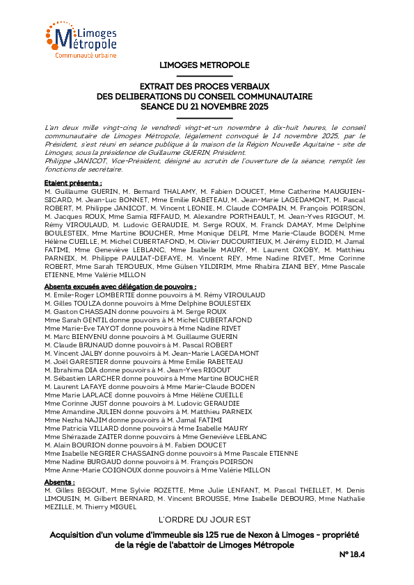 DélibérationAcquisition d'un volume d'immeuble sis 125 rue de Nexon à Limoges - propriété de la régie de l'abattoir de Limoges Métropole1 documentPublié le 5 Décembre 2025 Délibération du 21 novembre 2025 18_4.pdf (.pdf, 188,2 Ko) Télécharger PrécédentRetour à la listeSuivant