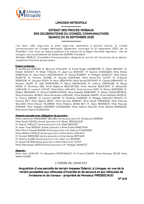 DélibérationAcquisition d’une parcelle de terrain impasse Diderot, à Limoges, en vue de la rendre accessible aux véhicules d’incendie et de secours et aux véhicules de livraisons et de travaux - propriété de Monsieur PRESSICAUD1 documentPublié le 3 Octobre 2025 Délibération du 25 septembre 2025 14_8.pdf (.pdf, 369,2 Ko) Télécharger PrécédentRetour à la listeSuivant