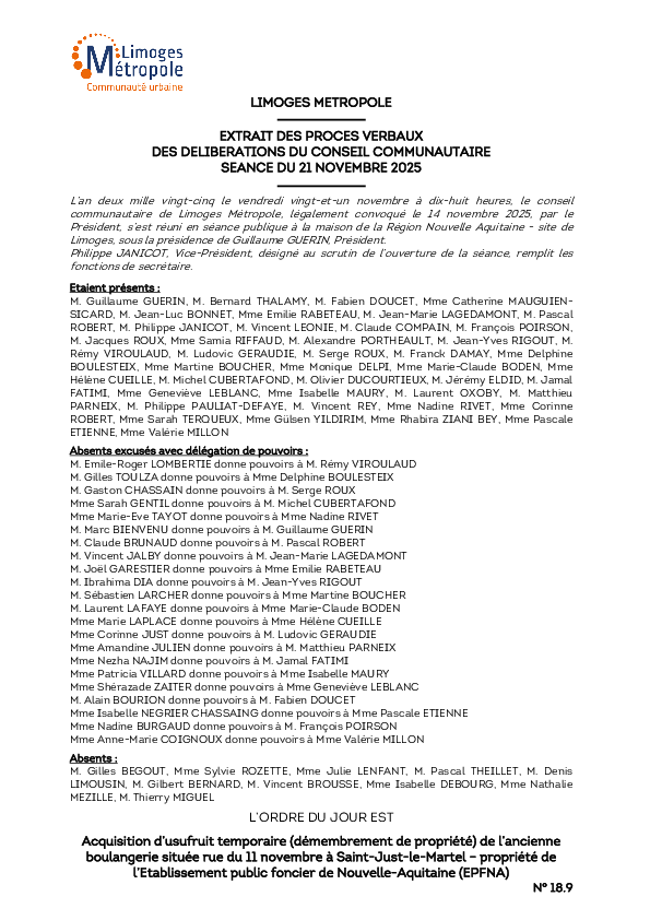 DélibérationAcquisition d’usufruit temporaire (démembrement de propriété) de l’ancienne boulangerie située rue du 11 novembre à Saint-Just-le-Martel – propriété de l’Etablissement public foncier de Nouvelle-Aquitaine (EPFNA)1 documentPublié le 4 Décembre 2025 Délibération du 21 novembre 2025 18_9.pdf (.pdf, 229,7 Ko) Télécharger PrécédentRetour à la listeSuivant