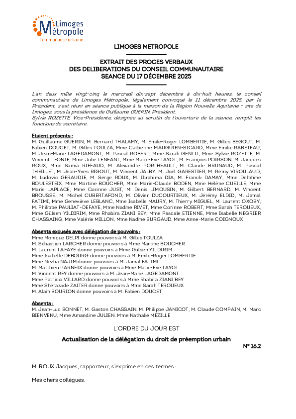 DélibérationActualisation de la délégation du droit de préemption urbain1 documentPublié le 24 Décembre 2025 Délibération du 17 décembre 2025 16_2.pdf (.pdf, 209,6 Ko) Télécharger PrécédentRetour à la listeSuivant