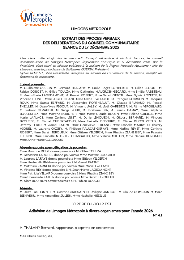 DélibérationAdhésion de Limoges Métropole à divers organismes pour l'année 20261 documentPublié le 23 Décembre 2025 Délibération du 17 décembre 2025 4_1.pdf (.pdf, 425,6 Ko) Télécharger PrécédentRetour à la listeSuivant
