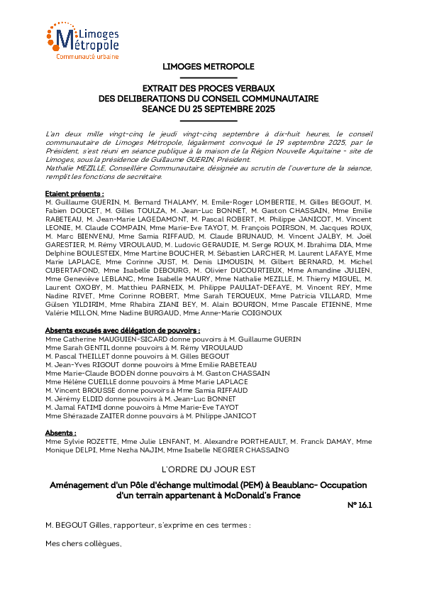 DélibérationAménagement d'un Pôle d'échange multimodal (PEM) à Beaublanc- Occupation d'un terrain appartenant à McDonald’s France1 documentPublié le 29 Septembre 2025 Délibération du 25 septembre 2025 16_1.pdf (.pdf, 366,9 Ko) Télécharger PrécédentRetour à la listeSuivant