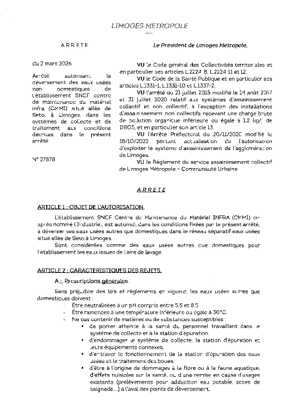ArrêtéArrêté autorisant le déversement des eaux usées non domestiques de l'établissement SNCF centre de maintenance du matériel infra (CMMI) situé allée de Seto, à Limoges, dans les systèmes de collecte et de traitement1 documentPublié le 5 Mars 2026 27878.pdf (.pdf, 1,1 Mo) Télécharger PrécédentRetour à la listeSuivant