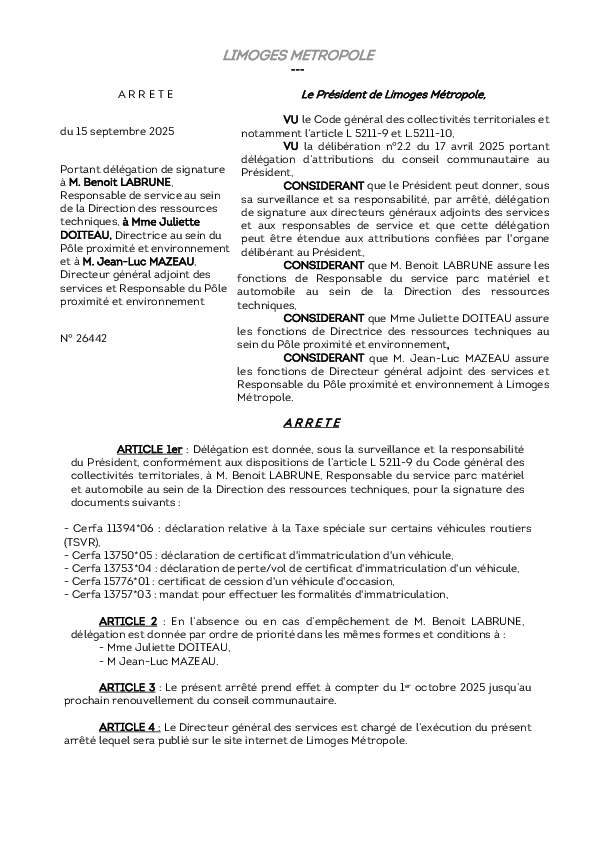 ArrêtéArrêté portant délégation de signature à M. Benoit LABRUNE, Responsable de service, Mme Juliette DOITEAU, Directrice, et à M. Jean-Luc MAZEAU, Directeur général adjoint des services, Responsable du Pôle proximité et environnement1 documentPublié le 30 Septembre 2025 26442.pdf (.pdf, 320,1 Ko) Télécharger PrécédentRetour à la listeSuivant