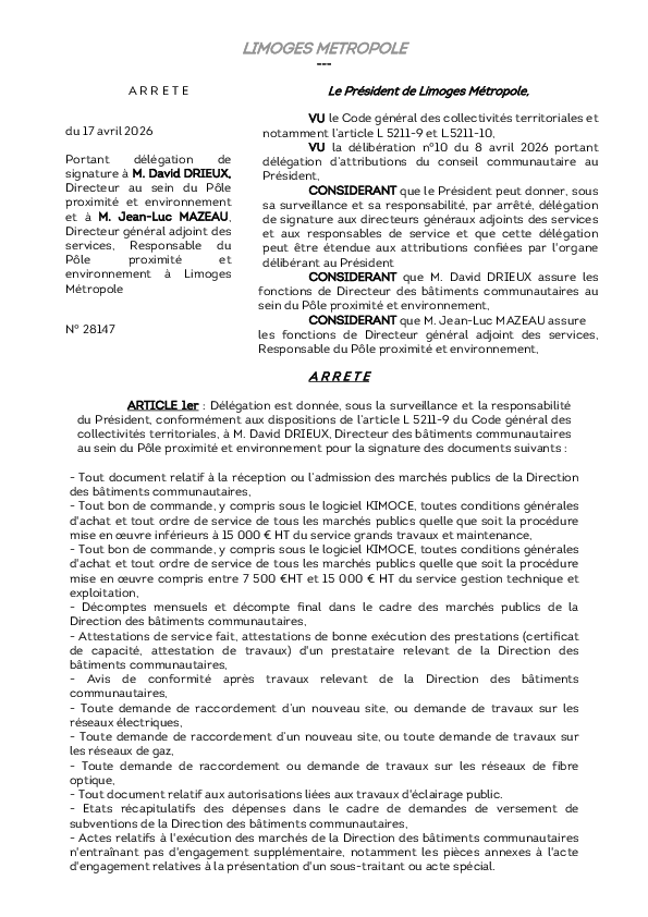ArrêtéArrêté portant délégation de signature à M. David DRIEUX, Directeur au sein du Pôle proximité et environnement et à M. Jean-Luc MAZEAU, Directeur général adjoint des services, Responsable du Pôle proximité et environnement1 documentPublié le 17 Avril 2026 28147.pdf (.pdf, 160,4 Ko) Télécharger PrécédentRetour à la listeSuivant