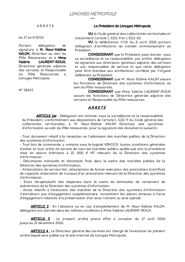 ArrêtéArrêté portant délégation de signature à M. Nour-Eddine KALIM, Directeur au sein du Pôle Ressources et à Mme Valérie LAURENT-ROUX, Directrice générale adjointe des services et Responsable du Pôle Ressources à Limoges Métropole1 documentPublié le 17 Avril 2026 28143.pdf (.pdf, 159,4 Ko) Télécharger PrécédentRetour à la listeSuivant