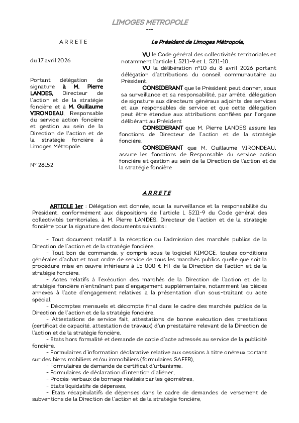 ArrêtéArrêté portant délégation de signature à M. Pierre LANDES, Directeur de l’action et de la stratégie foncière et à M Guillaume VIRONDEAU, Responsable de service au sein de la Direction de l'action et de la stratégie foncière1 documentPublié le 17 Avril 2026 28152.pdf (.pdf, 160,8 Ko) Télécharger PrécédentRetour à la listeSuivant