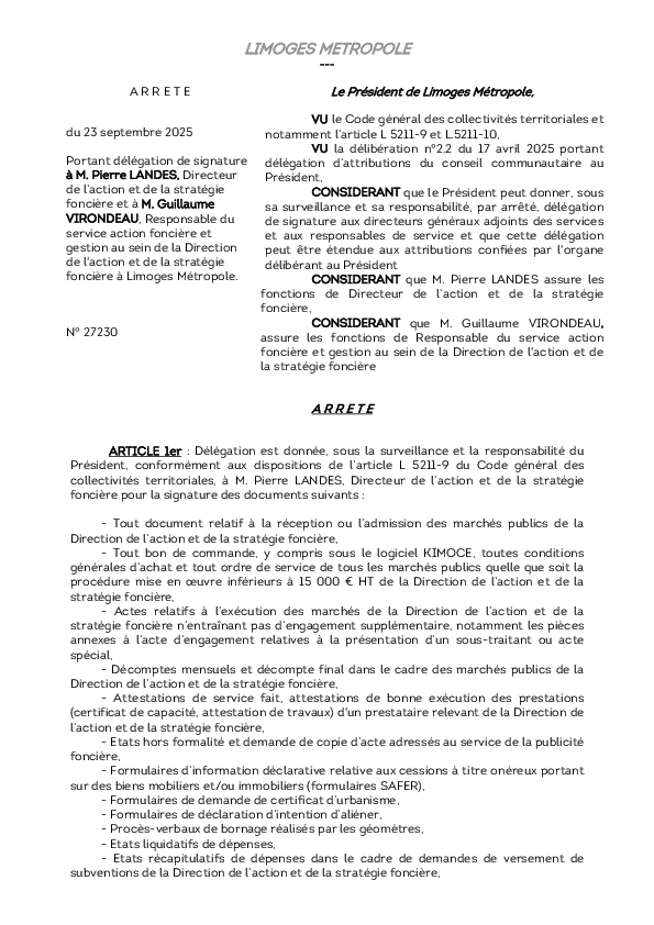 ArrêtéArrêté portant délégation de signature à M. Pierre LANDES, Directeur de l’action et de la stratégie foncière et à M Guillaume VIRONDEAU, Responsable de service au sein de la Direction de l'action et de la stratégie fonciè1 documentPublié le 30 Septembre 2025 27230.pdf (.pdf, 160,8 Ko) Télécharger PrécédentRetour à la listeSuivant