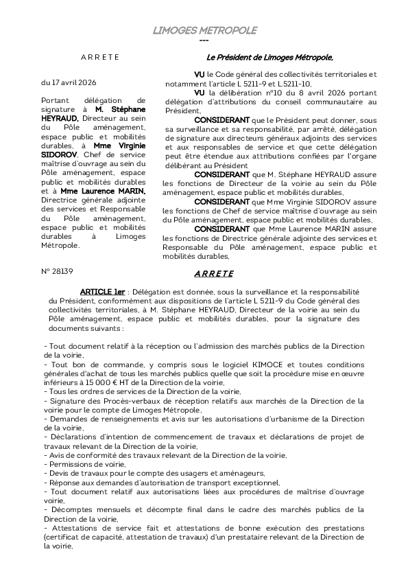 ArrêtéArrêté portant délégation de signature à M. Stéphane HEYRAUD, Directeur, à Mme Virginie SIDOROV, Chef de service à Mme Laurence MARIN, Directrice générale adjointe des services1 documentPublié le 17 Avril 2026 28139.pdf (.pdf, 160,5 Ko) Télécharger PrécédentRetour à la listeSuivant