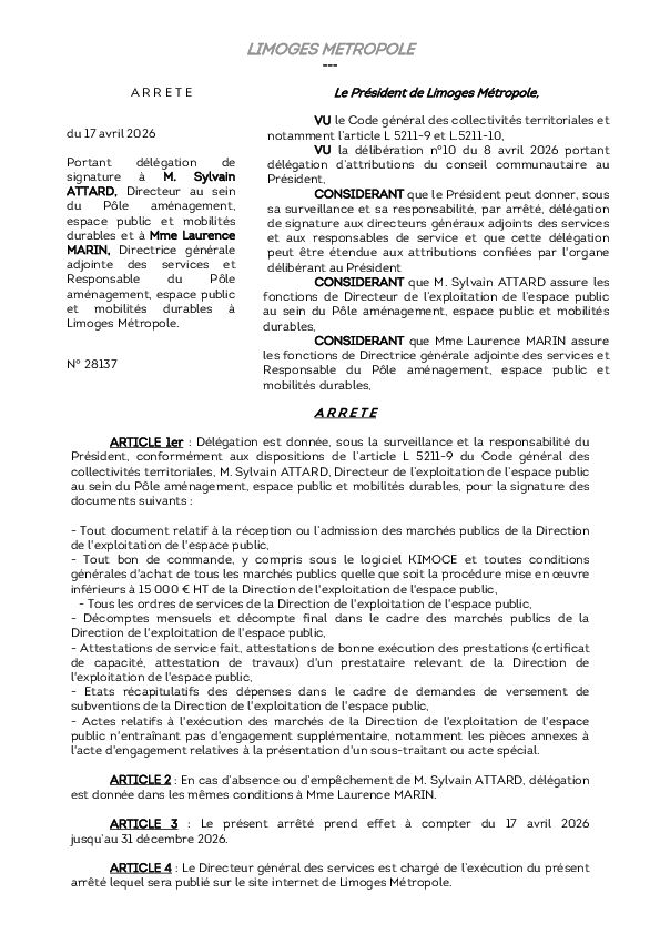 ArrêtéArrêté portant délégation de signature à M. Sylvain ATTARD, Directeur au sein du Pôle aménagement, espace public et mobilités durables et à Mme Laurence MARIN, Directrice générale adjointe des services1 documentPublié le 17 Avril 2026 28137.pdf (.pdf, 159,4 Ko) Télécharger PrécédentRetour à la listeSuivant