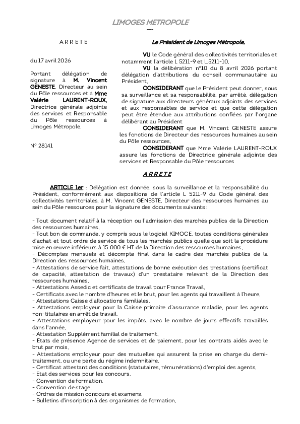 ArrêtéArrêté portant délégation de signature à M. Vincent GENESTE, Directeur au sein du Pôle ressources et à Mme Valérie LAURENT-ROUX, Directrice générale adjointe des services et Responsable du Pôle ressources à Limoges Métropole1 documentPublié le 17 Avril 2026 28141.pdf (.pdf, 161,4 Ko) Télécharger PrécédentRetour à la listeSuivant