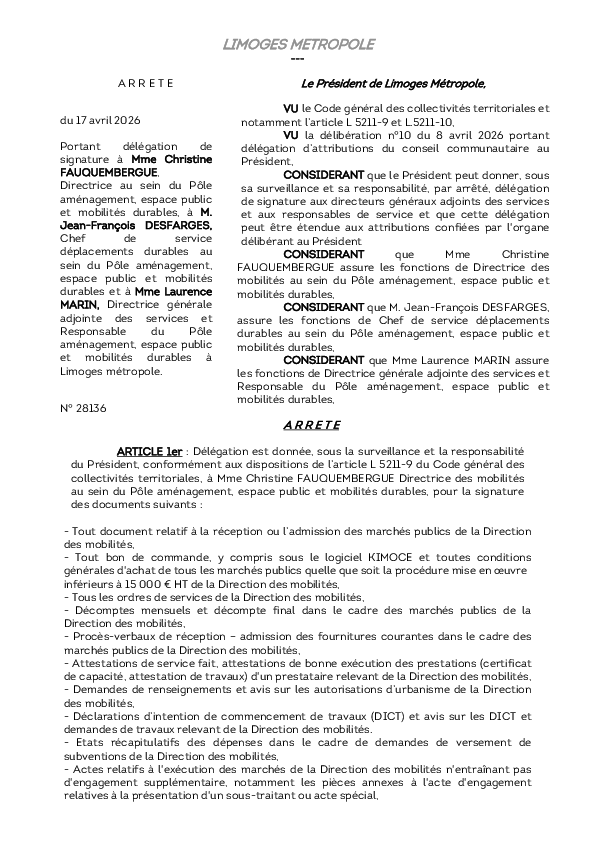 ArrêtéArrêté portant délégation de signature à Mme Christine FAUQUEMBERGUE, Directrice, à M. Jean-François DESFARGES, Chef de service déplacements durables et à Mme Laurence MARIN, Directrice générale adjointe des services1 documentPublié le 17 Avril 2026 28136.pdf (.pdf, 161,0 Ko) Télécharger PrécédentRetour à la listeSuivant