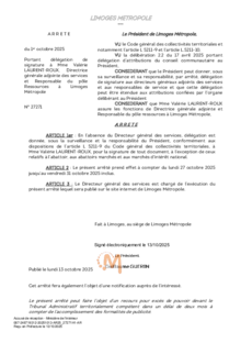 ArrêtéArrêté portant délégation de signature à Mme Valérie LAURENT-ROUX, Directrice générale adjointe des services et Responsable du Pôle ressources à Limoges Métropole1 documentPublié le 13 Octobre 2025 27271.pdf (.pdf, 156,3 Ko) Télécharger PrécédentRetour à la listeSuivant