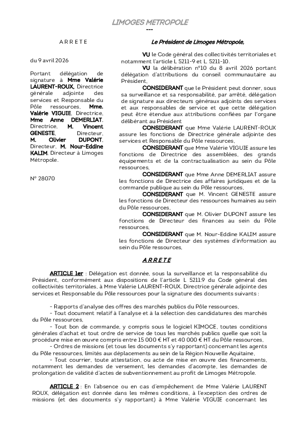 ArrêtéArrêté portant délégation de signature à Mme Valérie LAURENT ROUX, Directrice générale adjointe des services, Mme Valérie VIGUIE, Mme Anne DEMERLIAT, Directrices, M. Olivier DUPONT, Vincent GENESTE et Nour-Eddine KALIM, Directeurs1 documentPublié le 9 Avril 2026 28070.pdf (.pdf, 160,4 Ko) Télécharger PrécédentRetour à la listeSuivant