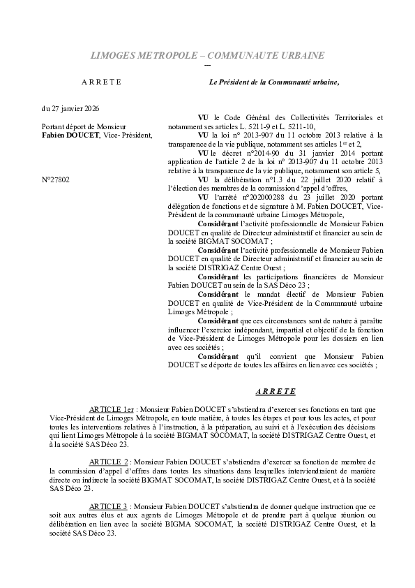 ArrêtéArrêté portant déport de Monsieur Fabien DOUCET, Vice- Président1 documentPublié le 27 Janvier 2026 27802.pdf (.pdf, 240,8 Ko) Télécharger PrécédentRetour à la listeSuivant