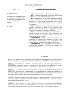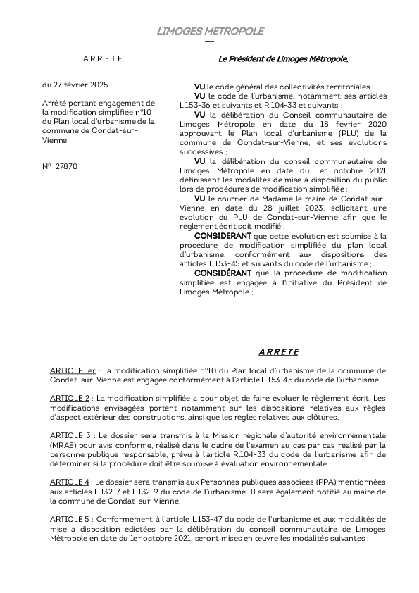 ArrêtéArrêté portant engagement de la modification simplifiée n°10 du Plan local d’urbanisme de la commune de Condat-sur-Vienne1 documentPublié le 27 Février 2026 27870.pdf (.pdf, 185,2 Ko) Télécharger PrécédentRetour à la listeSuivant