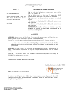 ArrêtéArrêté portant mise à jour du Plan local d’urbanisme de la commune de Chaptelat1 documentPublié le 21 Novembre 2025 27479.pdf (.pdf, 7,1 Mo) Télécharger PrécédentRetour à la listeSuivant