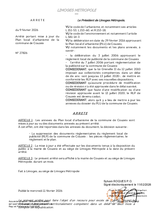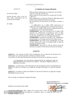 ArrêtéArrêté portant mise à jour du Plan local d’urbanisme de la commune de Couzeix1 documentPublié le 11 Février 2026 27826.pdf (.pdf, 2,1 Mo) Télécharger Retour à la listeSuivant