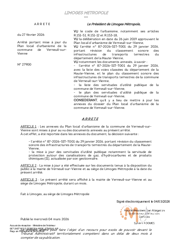ArrêtéArrêté portant mise à jour du Plan local d’urbanisme de la commune de Verneuil-sur-Vienne1 documentPublié le 4 Mars 2026 27900.pdf (.pdf, 6,1 Mo) Télécharger PrécédentRetour à la listeSuivant