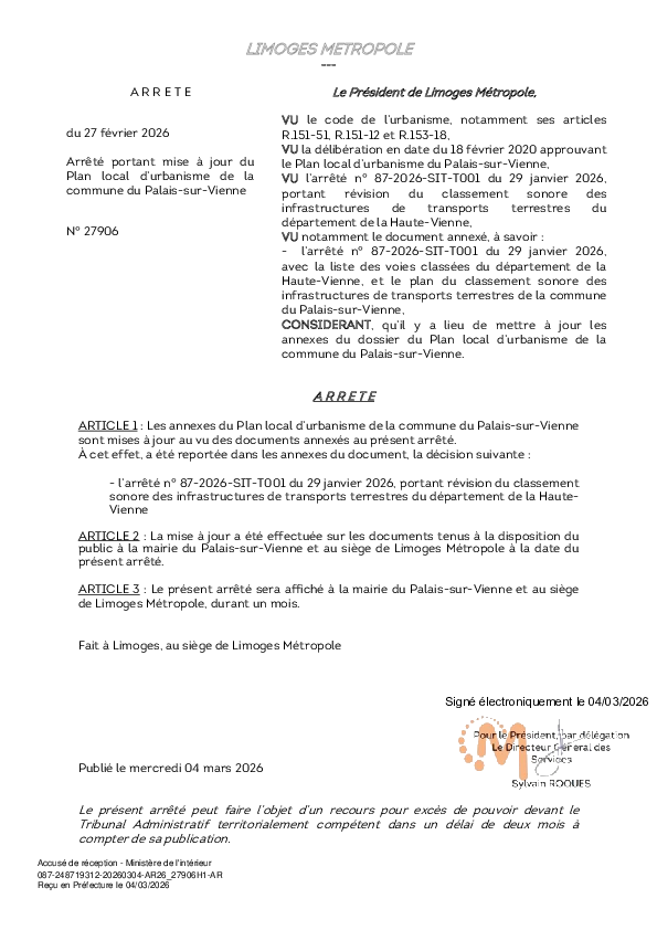 ArrêtéArrêté portant mise à jour du Plan local d’urbanisme de la commune du Palais-sur-Vienne1 documentPublié le 4 Mars 2026 27906.pdf (.pdf, 1,6 Mo) Télécharger PrécédentRetour à la listeSuivant