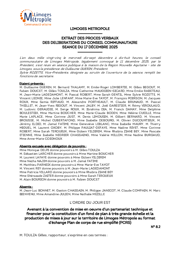 DélibérationAvenant à la convention de mise en oeuvre d'un partenariat technique et financier pour la constitution d'un fond de plan à très grande échelle et la production de mises à jour sur le territoire de Limoges Métropole au format d'échange PCRS1 documentPublié le 23 Décembre 2025 Délibération du 17 décembre 2025 8_2.pdf (.pdf, 221,0 Ko) Télécharger PrécédentRetour à la listeSuivant