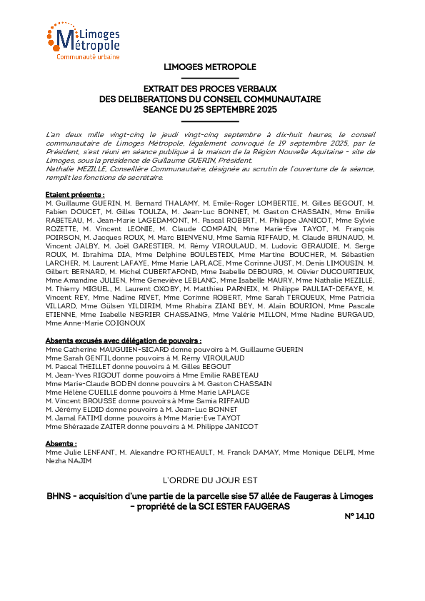 DélibérationBHNS - acquisition d’une partie de la parcelle sise 57 allée de Faugeras à Limoges – propriété de la SCI ESTER FAUGERAS1 documentPublié le 3 Octobre 2025 Délibération du 25 septembre 2025 14_10.pdf (.pdf, 761,0 Ko) Télécharger PrécédentRetour à la listeSuivant