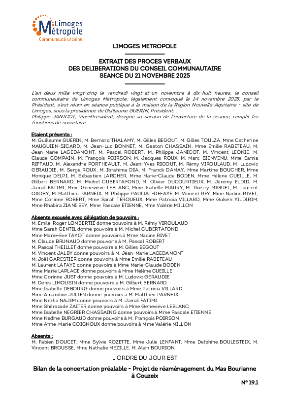DélibérationBilan de la concertation préalable - Projet de réaménagement du Mas Bourianne à Couzeix1 documentPublié le 4 Décembre 2025 Délibération du 21 novembre 2025 19_1.pdf (.pdf, 736,2 Ko) Télécharger PrécédentRetour à la listeSuivant