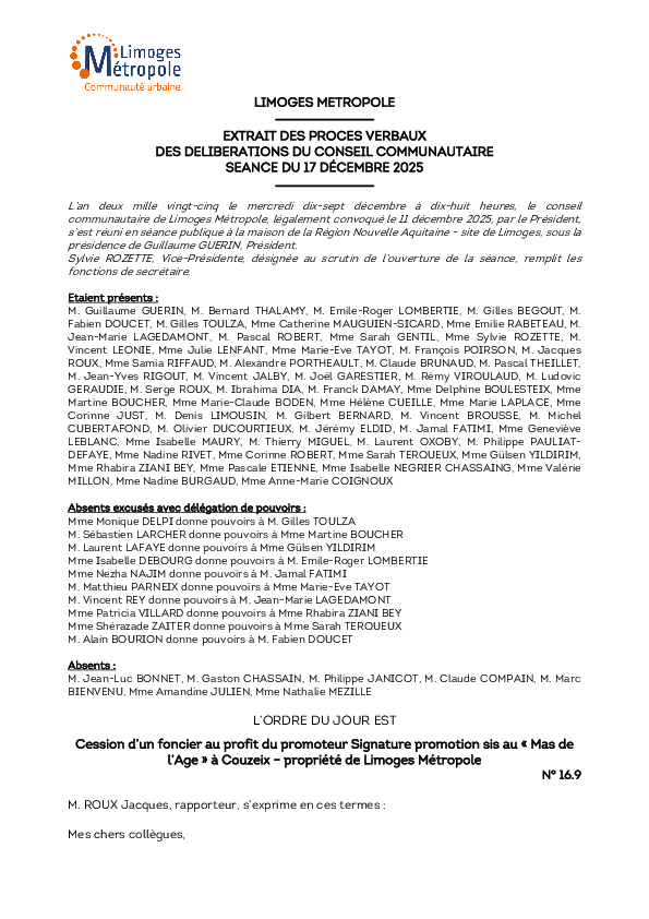DélibérationCession d’un foncier au profit du promoteur Signature promotion sis au « Mas de l’Age » à Couzeix – propriété de Limoges Métropole1 documentPublié le 24 Décembre 2025 Délibération du 17 décembre 2025 16_9.pdf (.pdf, 1,8 Mo) Télécharger PrécédentRetour à la listeSuivant