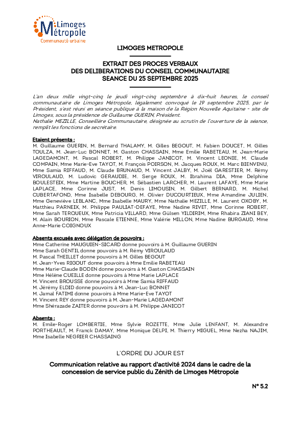 DélibérationCommunication relative au rapport d'activité 2024 dans le cadre de la concession de service public du Zénith de Limoges Métropole1 documentPublié le 3 Octobre 2025 Délibération du 25 septembre 2025 5_2.pdf (.pdf, 15,8 Mo) Télécharger PrécédentRetour à la listeSuivant