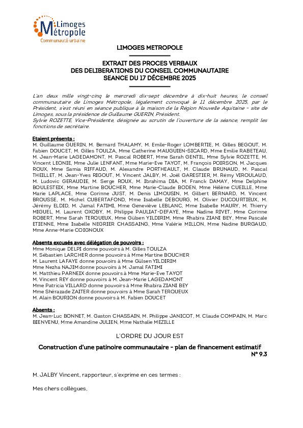 DélibérationConstruction d'une patinoire communautaire - plan de financement estimatif1 documentPublié le 23 Décembre 2025 Délibération du 17 décembre 2025 9_3.pdf (.pdf, 214,5 Ko) Télécharger PrécédentRetour à la listeSuivant